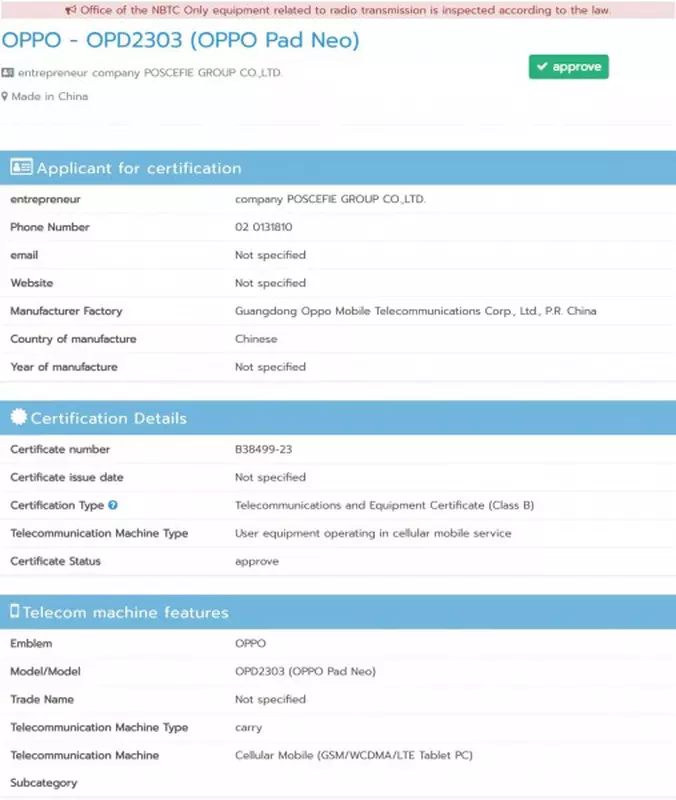 Volgens de database van het certificeringsbureau NBTC zal de nieuwigheid OPPO Pad Neo gaan heten. De tablet heeft het modelnummer OPD2303. Volgens de documenten zal de gadget LTE ondersteunen.
