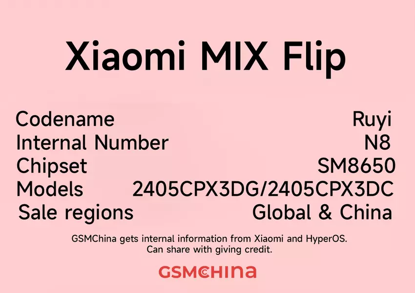 De nieuwigheid heeft de codenaam Ruyi en modelnummers 2405CPX3DG/2405CPX3DC. De gadget krijgt twee schermen: het hoofdscherm en een extra scherm aan de buitenkant. De smartphone wordt uitgerust met een dubbele Leica camera. De Xiaomi MIX Flip wordt aangedreven door de Snapdragon 8 Gen 3-processor van het vlaggenschip.