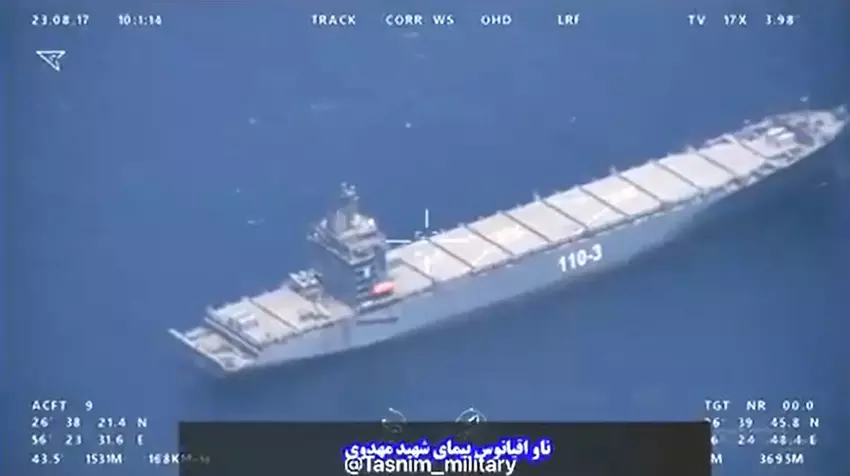 Het bijna officiële Iraanse persagentschap Tasnim publiceerde foto's en video's waarop te zien is hoe een Shahid Mahdavi-achtig schip (foto hieronder) en andere schepen, ondersteund door drones, de Amerikaanse troepen in de gaten houden. Het incident vond plaats op 17 augustus 2023.