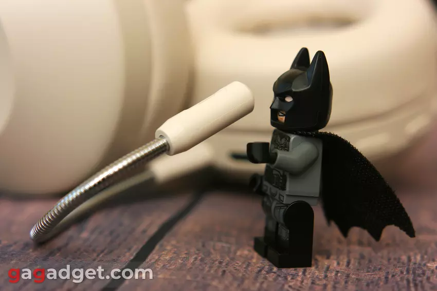 De afneembare microfoon heeft een 10 centimeter lange flexibele chromen poot, die je naar wens kunt buigen en draaien. Voor de aansluiting wordt een driepins "micro jack" met een diameter van 2,5 mm gebruikt. Dit is niet de meest gebruikelijke oplossing, dus als je een microfoon verliest, zal het moeilijker zijn om een vergelijkbare te vinden dan bij de meer gebruikelijke 3,5mm-aansluitingen, die meestal worden gebruikt in gamerheadsets. De poort voor de audiokabel is trouwens standaard, 3,5 mm, en de volledige kabel heeft TRRS minijacks. Dat wil zeggen, met een bedrade verbinding krijg je niet alleen een hoofdtelefoon, maar een volwaardige headset met een microfoon.
