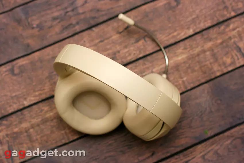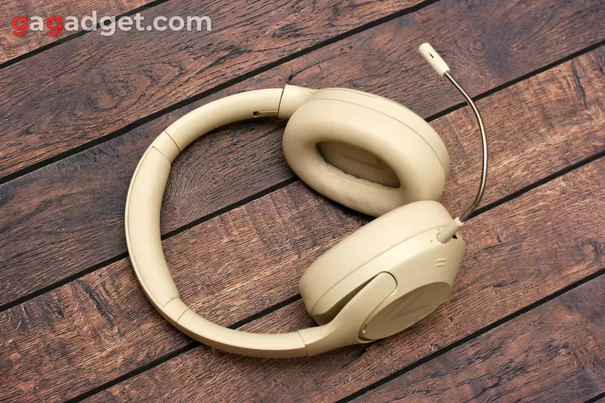 Ah, er is nog een knop, geheim en onzichtbaar. Om precies te zijn, niet eens een knop, maar een aanraakvlak. Het centrale platte deel van de rechter schaal is een aanraakgevoelige knop. Als je je vinger erop legt terwijl je hem vasthoudt, wordt het geluid in de hoofdtelefoon gedempt en wordt de transparantiemodus geactiveerd. Dat wil zeggen dat het ruisonderdrukkingssysteem externe geluiden niet onderdrukt, maar juist versterkt, zodat je ze kunt horen alsof je de hoofdtelefoon helemaal af hebt. Het is een erg handige functie. Als je hier twee keer op tikt, wordt de basversterkingsmodus gestart en als je hier drie keer op tikt, wordt de gamingmodus met verminderde vertraging gestart.