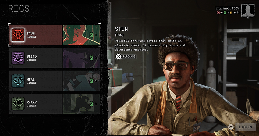Er zijn echter drie personages in de basis die je graag (en voor geld) beter maken. De eerste is Cornelius Noakes. Hij is een ingenieur en verkoopt verschillende gadgets. Je kunt bijvoorbeeld een gadget kopen dat de vijand een bepaalde tijd tegenhoudt, zodat jij en je vrienden opnieuw kunnen inzetten. Of je kunt een apparaat kopen dat de gezondheid van iedereen om je heen herstelt. Er zijn in totaal 4 van zulke gadgets, en het zou leuk zijn als iedereen in je compagnie verschillende kocht, want je kunt er maar één bij je dragen. Tegelijkertijd kan elke gadget verder worden verbeterd om nieuwe mogelijkheden te creëren.