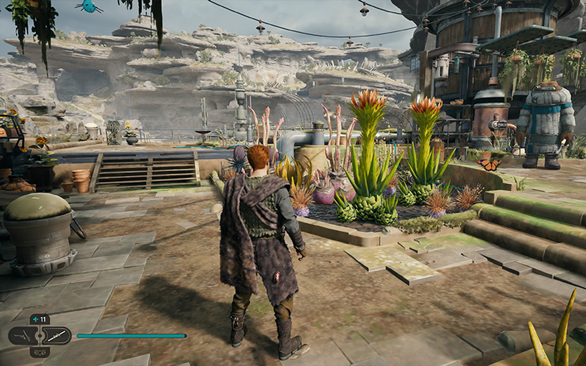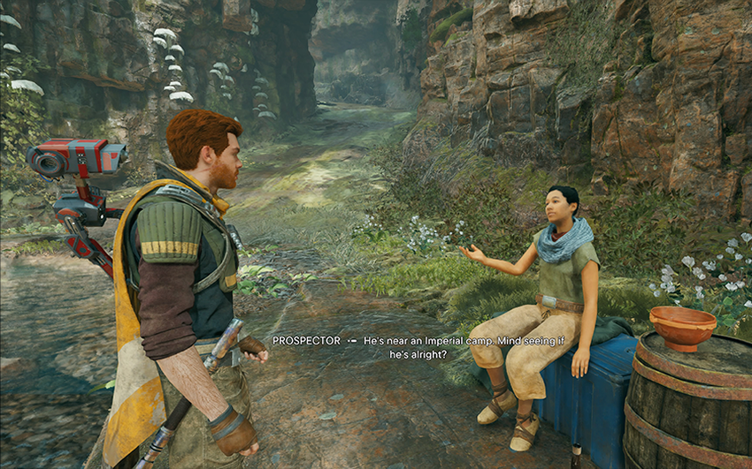 Het is belangrijk om de vraag te beantwoorden: "waarom is het interessant om dit alles te verkennen, zelfs voor wie geen fan is van open werelden?". De wereld van Jedi: Survivor voelt levendig aan. Het is heel normaal om stormtroopers tegen te komen die een gigantische schorpioen proberen te vernietigen, of wanneer droids iets niet met elkaar delen. En hoewel de meeste van deze gebeurtenissen gescript zijn, verlaat het gevoel dat deze wereld los van jou leeft niet tot het einde van het spel. Er zijn dus geen problemen met onderdompeling in een sterrenstelsel ver, ver weg.
