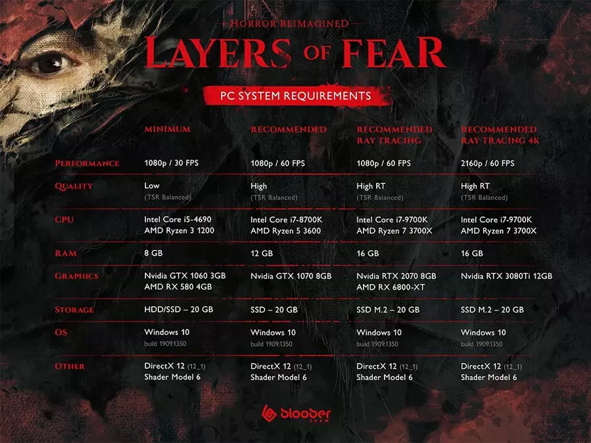 Layers of Fear ondersteunt de nieuwste technologie, dus de systeemeisen zijn passend. In de demoversie is alles vrij trouw aan de hardware, maar in de volledige versie van de horror zullen de systeemeisen waarschijnlijk hoger liggen.