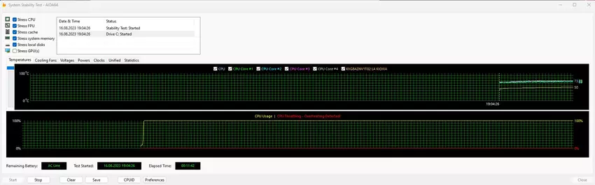 Twee miniatuurventilatoren zijn verantwoordelijk voor de koeling en ze zijn hoorbaar bij maximale belasting. Maar het geluid is niet hard of storend. Het koelsysteem doet zijn werk. Onder belasting warmen de componenten op tot ongeveer 75°, en het systeem werkt stabiel zonder enige prestatievermindering.