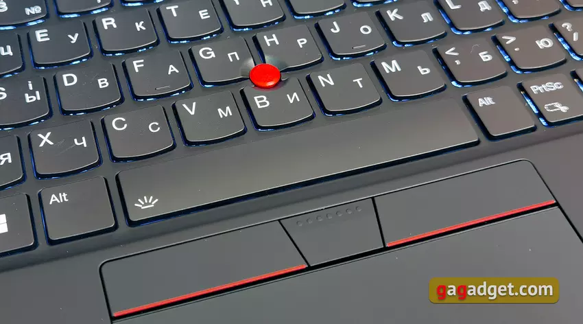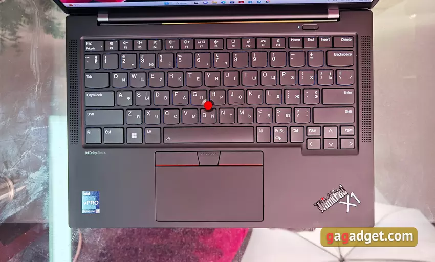 Het toetsenbord ligt iets verzonken in het werkoppervlak. Er zitten luidsprekers aan de zijkanten, hoewel dit geen invloed heeft gehad op de lay-out, het is absoluut standaard voor de Lenovo ThinkPad X1 Carbon lijn, dus alles zal vertrouwd zijn voor kenners. En voor degenen die net hebben besloten om over te stappen op ThinkPad, zullen er een paar dingen zijn om aan te wennen. Er zijn aparte knoppen Home, End en Delete aan het einde van de bovenste rij, het pijlblok is iets naar de gebruiker verschoven en de knoppen PgUp en PgDn zijn aan de zijkanten van de pijl omhoog geplaatst. PrtSc bevindt zich tussen de knoppen Alt en Ctrl rechts. En een traditionele functie: Fn en linker Ctrl zijn verwisseld. Maar dit kan worden ingesteld in de Lenovo Vantage app.
