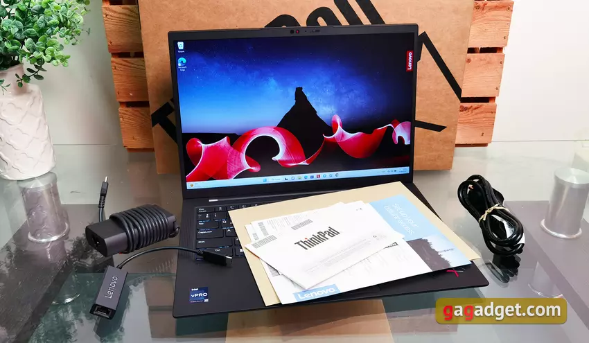 Lenovo ThinkPad X1 Carbon Gen 11 is verpakt in een standaard recyclebare mosterdkartonnen doos. Het bedrijf is volledig afgestapt van het gebruik van plastic in verpakkingen. Binnenin zit een redelijk vertrouwde set. De laptop zelf, een compacte 65W voeding, een stroomkabel, een ethernetadapter en documentatie.