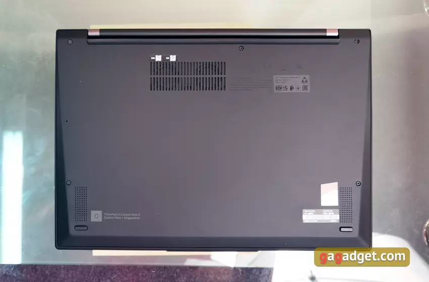 De behuizing is nog steeds gemaakt van magnesiumlegering en koolstofvezel. Dankzij deze materialen is de behuizing zeer duurzaam en licht. De laptop is verkrijgbaar in twee ontwerpopties: met een koolstofvezel textuur of een meer bekende zwarte deksel met een matte afwerking, die erg lijkt op Soft Touch. Wij hadden de laatste optie. Het oogt en voelt erg mooi, maar het verzamelt een beetje afdrukken. Er is een klein Lenovo-logo in de rechterbenedenhoek van de bovenklep en een ThinkPad-logo met een rode LED-indicator linksboven.