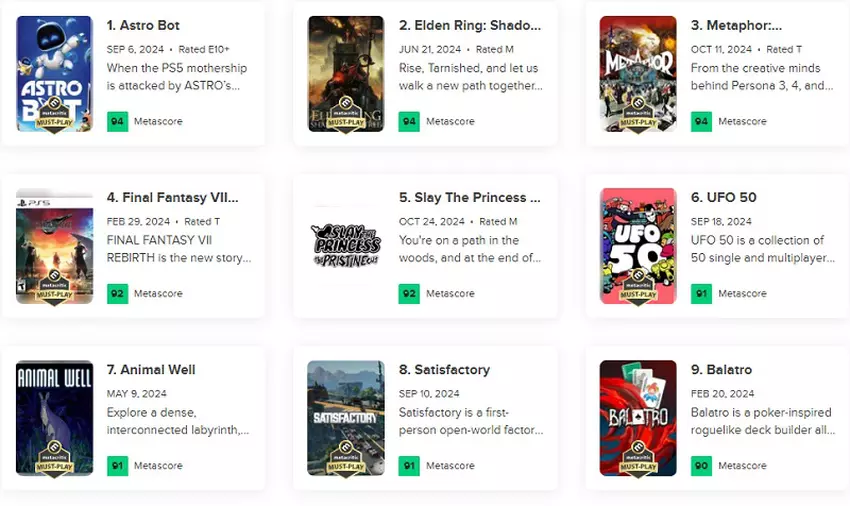 Volgens schattingen van journalisten werden de platformgame Astro Bot en JRPG Metaphor: ReFantazio de best beoordeelde games van 2024. De uitbreiding Shadow of the Erdtree voor Elden Ring deelt echter de eerste plaats met hen. Zo kregen drie projecten elk 94 punten en werden ze de beste.