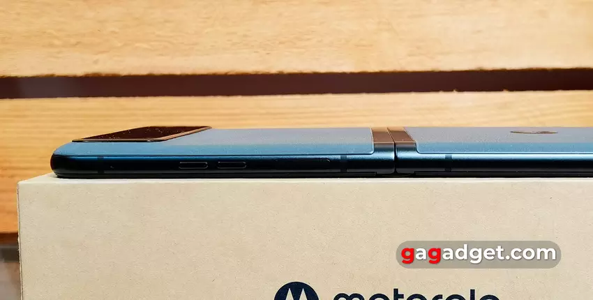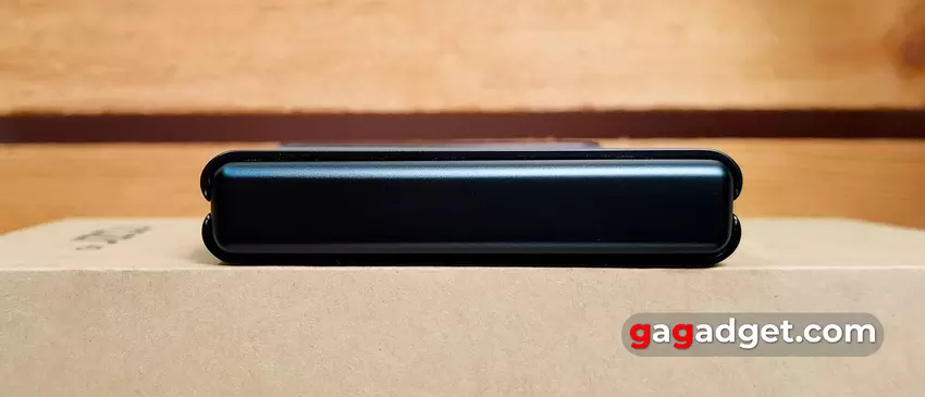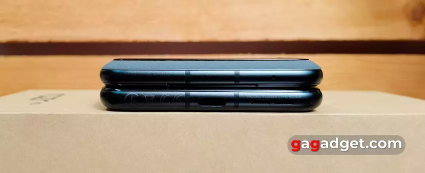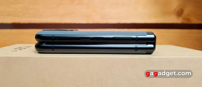 Het frame van de smartphone is gemaakt van aluminium uit de 7000-serie en heeft een mat oppervlak. In gesloten toestand zijn de helften stevig op elkaar geperst, zonder spleten. Functionele elementen zitten op dezelfde plaatsen als in het oudere model. Aan de rechterkant van de smartphone zit een van de extra microfoons, aparte volumeknoppen en een grote aan/uit-knop, die ook een vingerafdrukscanner is. Je zult moeten wennen aan de plaatsing van de knoppen, zoals in alle clamshells: ze zijn iets hoger geplaatst dan in conventionele smartphones.