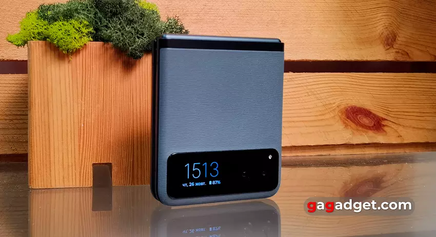 Structureel lijkt de Motorola Razr 40 op het oudere Razr 40 Ultra model, maar er zijn een aantal significante verschillen. De eerste en belangrijkste is de grootte en functionaliteit van het externe display. In de Motorola Razr 40 is de diagonaal slechts 1,5 inch en bevindt zich onder een gemeenschappelijke beschermende Gorilla Glass Victus met een dubbele camera. Bij de Ultra zijn de buitenste panelen van glas (behalve bij de Magenta variant), wat er representatief uitziet, maar niet erg praktisch. Het matglas verzamelt geen vingerafdrukken, maar is wel erg glad. Bij de Motorola Razr 40 zijn de buitenpanelen gemaakt van kunstleer. Het ziet er ook interessant uit en ligt goed in de hand. Uitgevouwen hebben we een bijna typische moderne smartphone met een frontcamera in het gat en een iets bredere rand rond de omtrek dan gebruikelijk. Het scherm is in de fabriek voorzien van een beschermfolie, maar die moet je niet zelf verwijderen. Het lijkt erop dat het alleen kan worden vervangen in een servicecentrum.