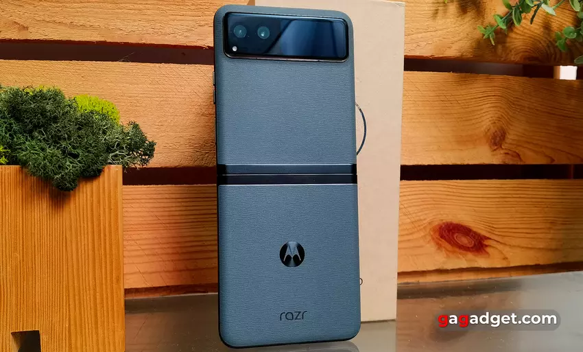 Beide helften van de smartphone zijn bijna volledig bedekt met kunstleer. Er zijn metalen inzetstukken in het midden en een breed glazen blok met camera's en een display bovenop. Op de onderste helft staan de logo's van Motorola en Razr. Het eco-leer is verrassend aangenaam, zowel tactiel als visueel. Over het algemeen ziet de smartphone er goed uit en de combinatie van donkergroen en zwart is erg interessant. Subjectief gezien zien de lila en crèmekleurige varianten van de smartphone er niet zo verfijnd uit.