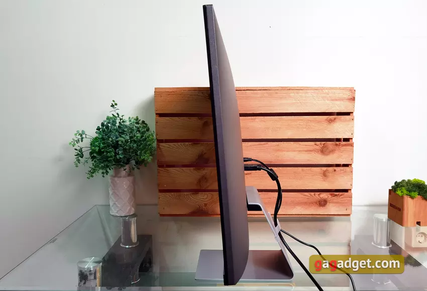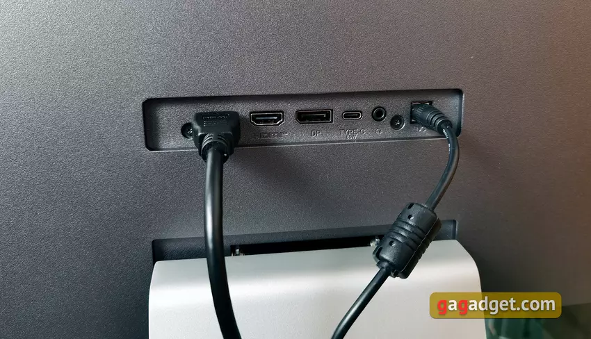 Alle aansluitingen bevinden zich in een kleine uitsparing net boven de standaard en wijzen naar achteren. Deze oplossing is erg handig als je vaak van kabel moet wisselen: je hoeft de monitor niet te verplaatsen of te kantelen.