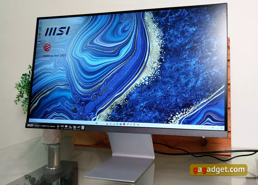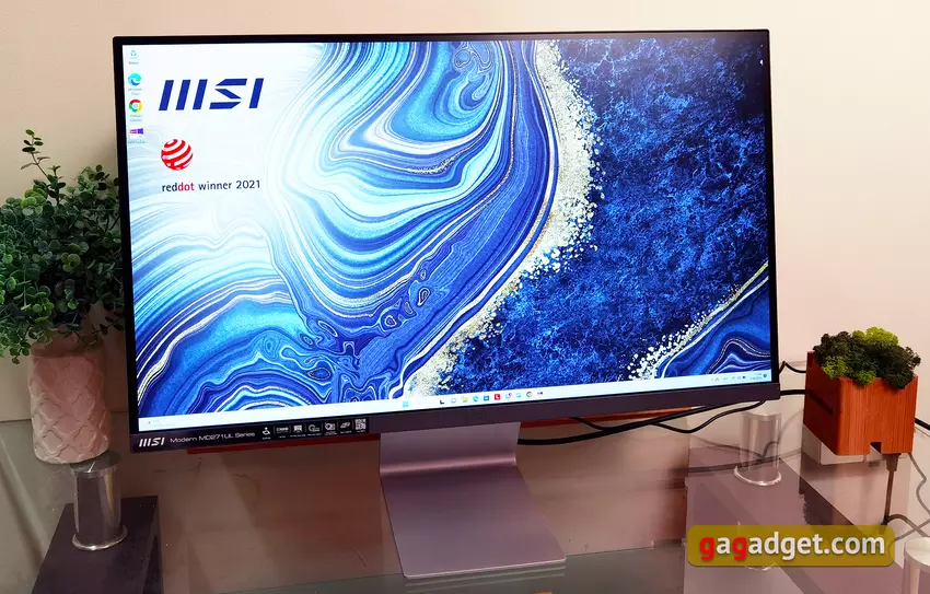 MSI Modern MD271UL is een interessante monitor ontworpen voor zakelijke gebruikers. Allereerst is het belangrijkste voordeel een hoogwaardig 27-inch IPS-scherm met een resolutie van 3840x2160, uitstekende kleurweergave, hoge helderheid en goede antireflectiecoating. Hierdoor kan het zowel voor kantoortaken als voor het werken met foto's of video's worden gebruikt. Hij is zeer eenvoudig en gebruiksvriendelijk en heeft een goede set aansluitingen. Hiervan is Type-C met Power Delivery ondersteuning het uitlichten waard, dankzij welke de moderne ultrabook kan worden aangesloten zonder extra voeding. De MSI Modern MD271UL ziet er stijlvol en minimalistisch uit en neemt niet veel ruimte in op het bureau. De enige klacht over de monitor is de standaard. Ja, hij ziet er geweldig uit, maar je kunt de monitor niet in hoogte verstellen of draaien. Portretmodus en muurbevestiging zijn ook uitgesloten.