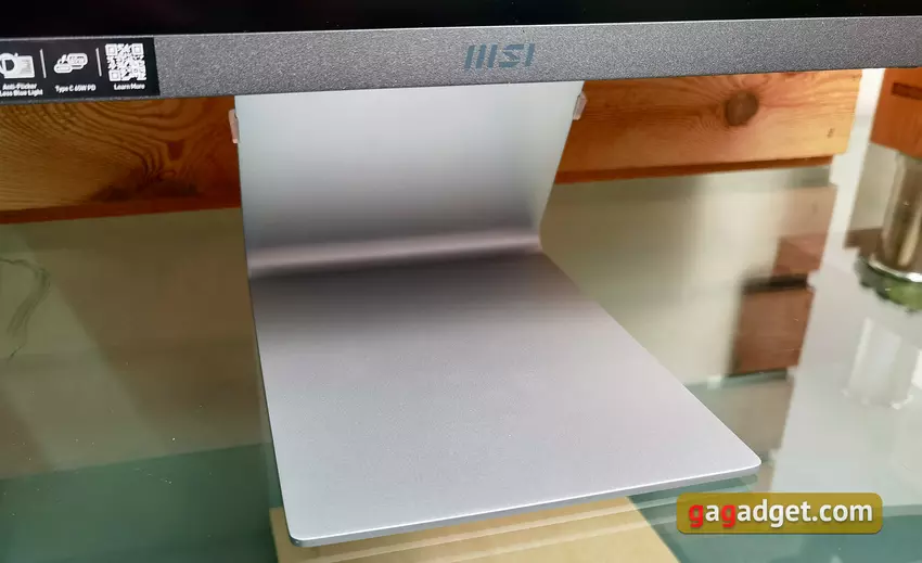 De standaard heeft een eenvoudige rechthoekige vorm met gebogen hoeken en een kantelhoek van 64,4°. Hij is gemaakt van een zilverkleurige aluminiumlegering. Hij is zwaar en breed genoeg om je monitor stevig op je bureau te houden.