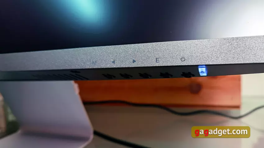 Er zijn 5 knoppen om de monitor in te stellen, naast de LED-indicator. Menu, navigatieknoppen, bevestiging en aan/uit. Een joystick zou handiger en intuïtiever zijn geweest, maar deze oplossing heeft het recht om te leven. Je moet wennen aan de knoppen: ze zitten vrij strak en de monitor wiebelt een beetje als je erop drukt.