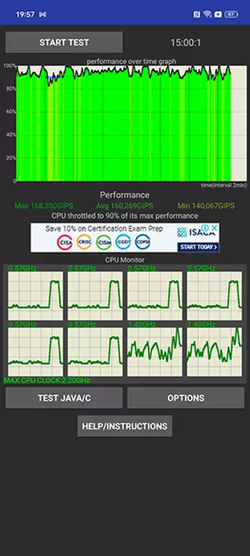 Aan de andere kant werkt de smartphone stabiel, de behuizing wordt niet heet tijdens gebruik. En de CPU Throttling Test toonde aan dat onder langdurige maximale belasting de prestaties tot 90% kunnen dalen, wat een vrij goede indicator is.