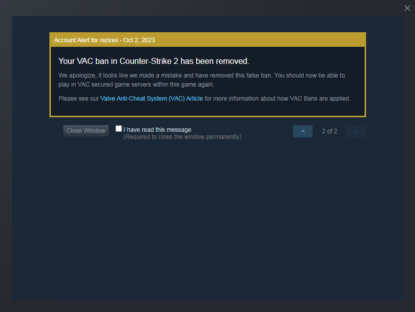 Eerst begonnen mensen erover te schrijven op Reddit. Spelers met Windows 7 begonnen in grote aantallen VAC BANs te ontvangen, die meestal worden gegeven voor het gebruik van cheats. Kort daarna hoorde Valve de spelers, verontschuldigde zich en begon ze te unbannen, maar het doet dit handmatig. En als jij ook zo'n probleem hebt, schrijf dan naar de Steam-ondersteuning.