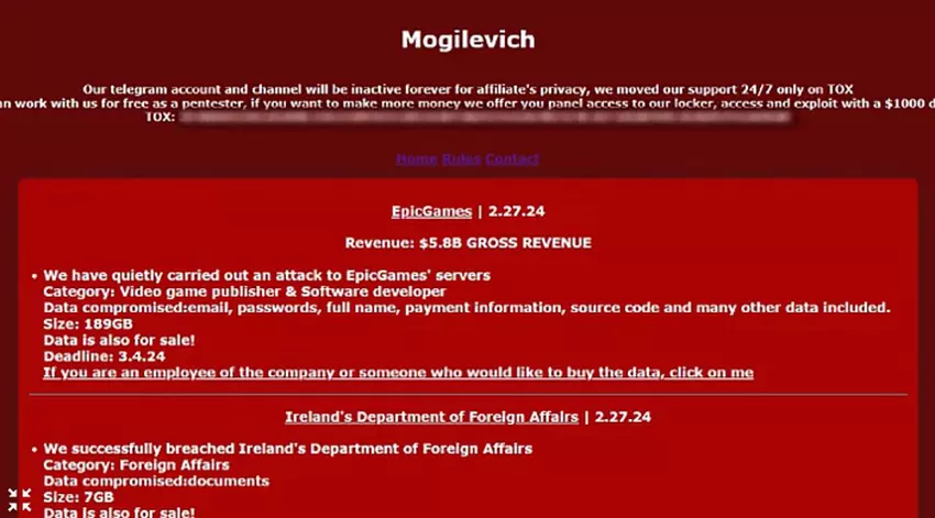 Mogilevich belooft de informatie openbaar te maken tenzij Epic Games of een andere koper voor 4 maart losgeld betaalt.