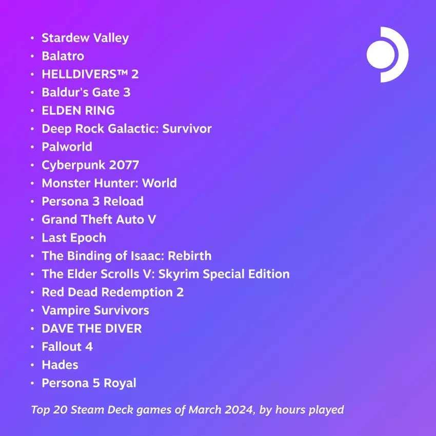 De 20 populairste games op Steam Deck in maart: Stardew Valley, Balatro en Helldivers 2 zijn de leiders