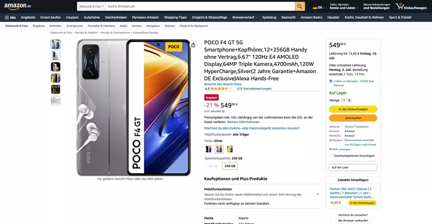 We hebben het over het model POCO F4 GT 5G in een versie met 256 GB ROM. Hij wordt verkocht voor check price on amazon.