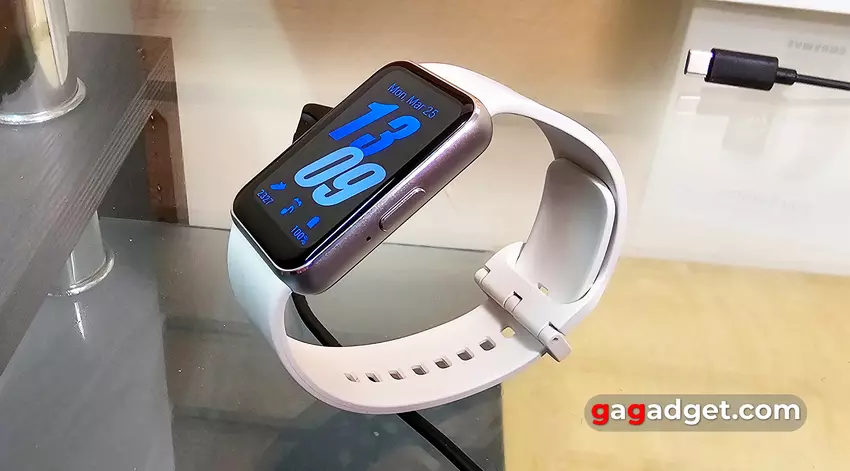 Het is goed om te onthouden dat de Samsung Galaxy Fit3 geen smartwatch is, maar een fitnessarmband met vrij beperkte functionaliteit en zonder de mogelijkheid om applicaties van derden te installeren. De armband draait op FreeRTOS, de Samsung processor is niet gespecificeerd, maar het apparaat heeft 16 MB RAM en 256 MB intern geheugen. Daarom is er geen mogelijkheid om muziek te downloaden voor training. Maar het besturingssysteem zelf is erg snel en verrassend soepel. De set sensoren bestaat uit een versnellingsmeter, barometer, gyroscoop, optische hartslagsensor en lichtsensor, d.w.z. de basisset die nodig is voor een moderne fitnesstracker. Wat draadloze interfaces betreft, is er alleen Bluetooth 5.3 voor verbinding met een smartphone. Samsung Galaxy Fit3 heeft geen eigen GPS-module, dus de locatie wordt bepaald door de smartphone voor looproutes.