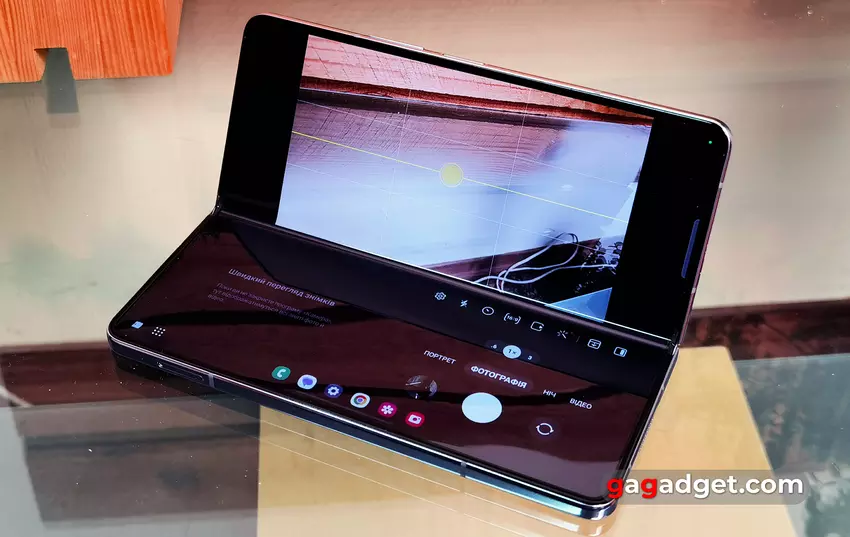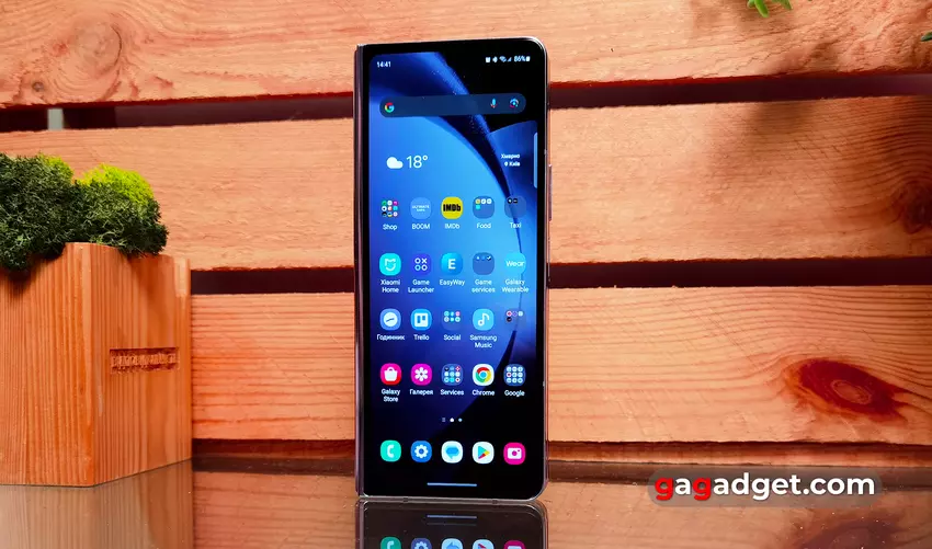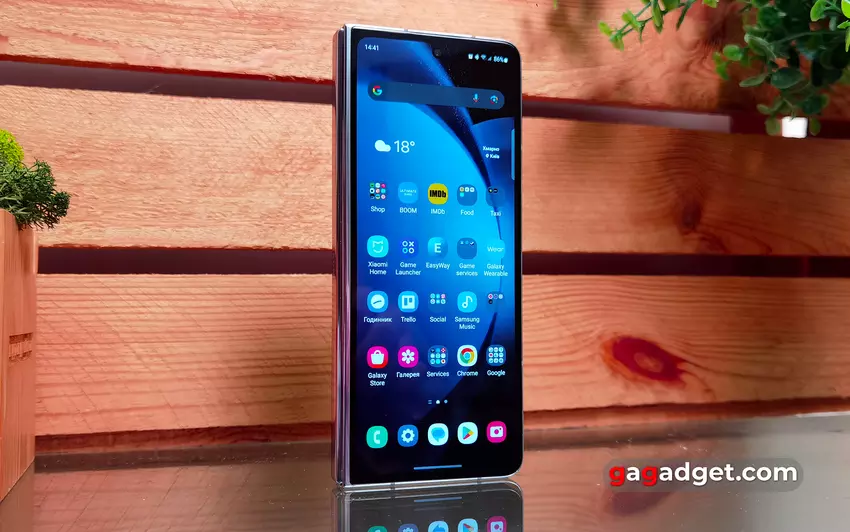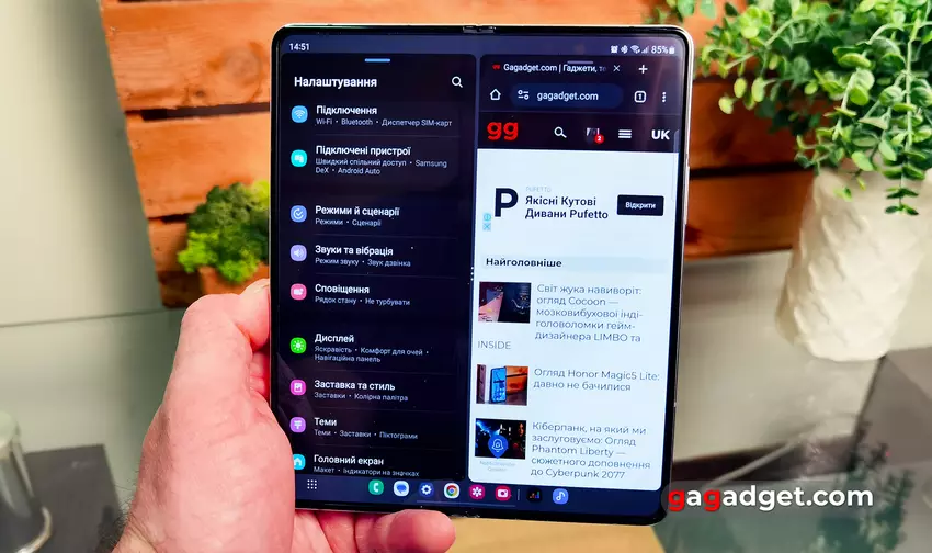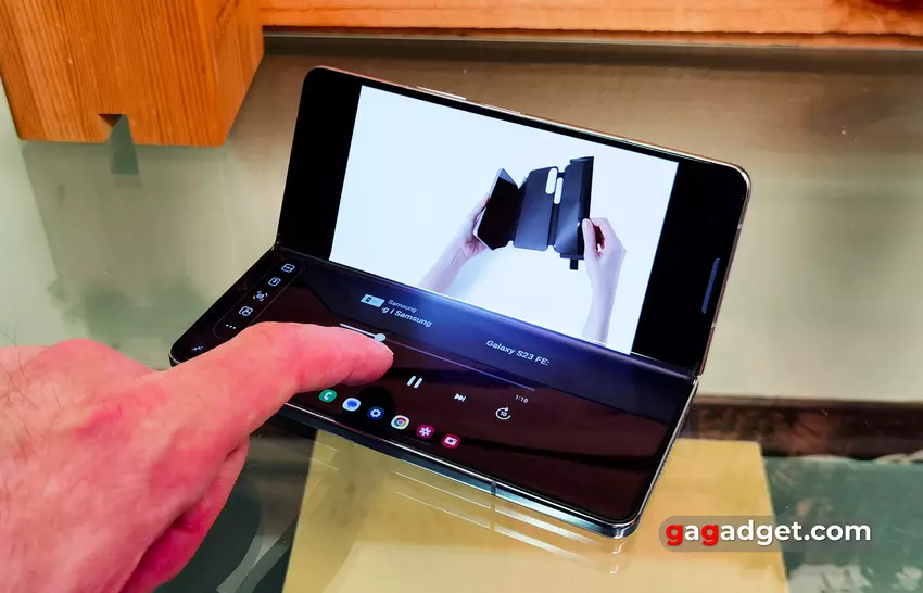 Alle Fold-smartphones, inclusief de Samsung Galaxy Fold5, zijn ontworpen om een mobiele alles-in-één "combinatie" te zijn voor het maximale aantal taken. Het externe scherm is voldoende voor gesprekken, instant messengers, berichten, mail, het gebruik van de camera en het schakelen tussen muzieknummers. In het algemeen alle eenvoudige taken die onderweg of onderweg kunnen voorkomen. Als je het scherm vergroot, is het interne scherm van 7,6 inch handiger voor het werken met documenten, het gebruiken van een browser, het lezen van boeken of het spelen van games (de meeste games zijn voldoende groot). Bij video is het voordeel niet zo groot vanwege de niet-standaard beeldverhouding. De zwarte gebieden onder en boven blijven vrij groot. Maar het grote scherm is niet het enige kenmerk. We moeten ook de extra softwarefuncties voor gebruiksgemak noemen die in de vorige generatie verschenen met One UI 4.1.1 en Android 12L, dat geoptimaliseerd was voor opvouwbare smartphones. In de Samsung Galaxy Fold5 kun je tot drie applicaties tegelijk openen op het hoofdscherm, hun volgorde en grootte wijzigen en deze instellingen opslaan om snel te starten vanuit de zijbalk. Ook is de onderste balk met snelkoppelingen voor applicaties behouden en verbeterd ten opzichte van de vorige generatie, wat doet denken aan een soortgelijke oplossing in pc-besturingssystemen. Dit paneel kan nu tot 12 apps bevatten, waaronder de 4 nieuwste.