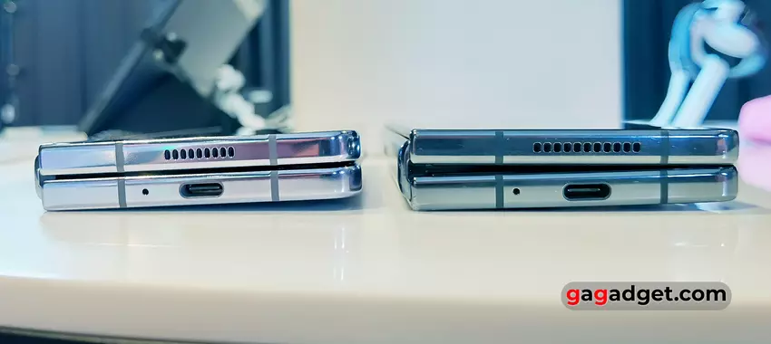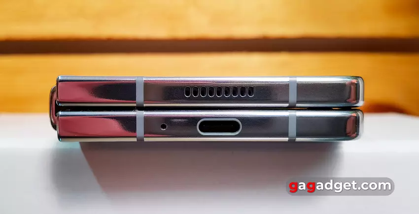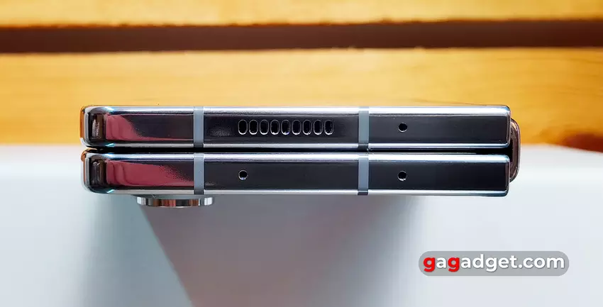 Er zijn niet veel verschillen tussen Samsung Galaxy Fold5 en Fold4, maar ze zijn er wel. Ten eerste is het de moeite waard om het vernieuwde scharnier te vermelden. Dankzij het nieuwe druppelvormige ontwerp zijn de technici van Samsung er eindelijk in geslaagd om de opening tussen de smartphonehelften bij het opvouwen, die bij alle vorige modellen aanwezig was, te verwijderen. Naast het esthetische aspect verzamelt de smartphone geen stof meer binnenin. Dit maakte het ook mogelijk om de dikte van de smartphone te verminderen: 13.4 mm in opgevouwen toestand en 6,1 mm in uitgevouwen toestand tegenover respectievelijk 15,8 en 6,3 mm bij de Galaxy Fold4. Maar de vouw op het scherm is er nog steeds. Laten we hopen dat de volgende generatie dit eindelijk kan verwijderen.