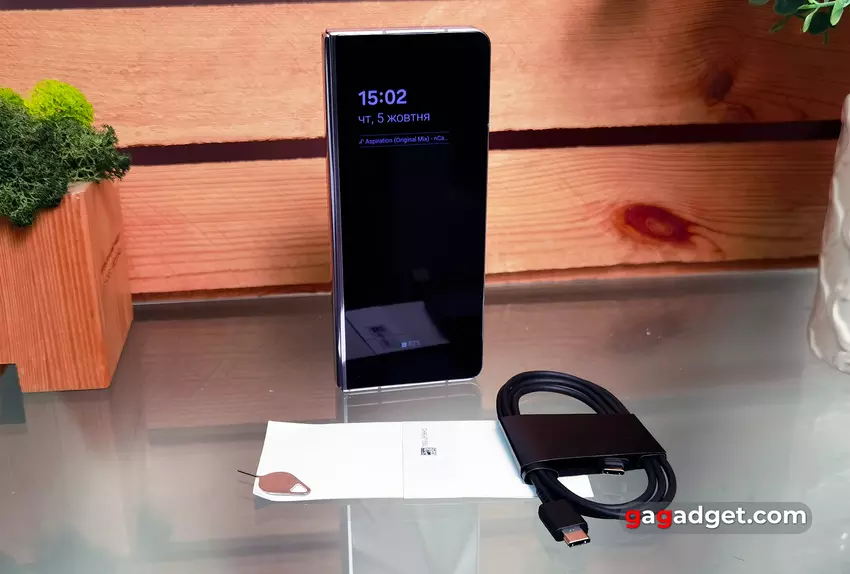 Er zijn geen grote verschillen tussen de Samsung Galaxy Fold5 en de vorige Samsung Galaxy Fold4. Net als voorheen wordt het boekvormige ontwerp gebruikt. Opgevouwen ziet het eruit als een typische smartphone met een hoog, smal scherm en een iets grotere dikte. Deze twee eigenschappen hebben een positief effect op het comfort van het gebruik van de smartphone onderweg: het is comfortabel om vast te houden en alle basisbewerkingen met één hand uit te voeren. We hebben het toestel niet kunnen vergelijken met de Galaxy Fold4. Het gewicht is met 10 g afgenomen en de dikte is nu gelijkmatig en ook minder dan die van het vorige model. Samsung Galaxy Fold5 zou dus iets comfortabeler moeten zijn. De gevouwen smartphone heeft een 6,2-inch scherm met vrij dunne randen en een frontcamera in een rond gat. Het frame van de smartphone is gemaakt van versterkt aluminium en de voor- en achterpanelen worden beschermd door Gorilla Glass Victus 2.