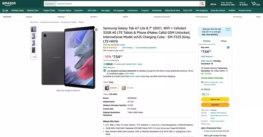 Samsung Galaxy Tab A7 Lite c LTE kan worden gekocht op Amazon met een korting van $30
