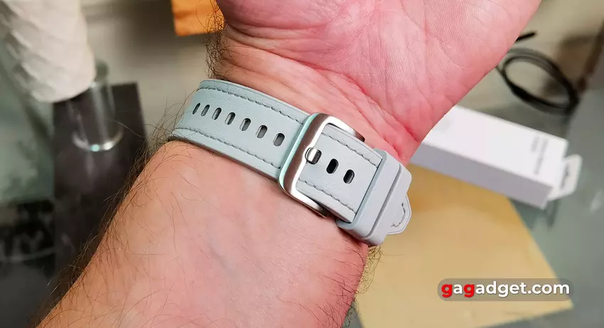 De meegeleverde band heeft een standaard sluiting en is gemaakt van twee materialen. De buitenste is gemaakt van eco-leer, de binnenste van siliconen. Het is vrij comfortabel en voelt prettig aan.