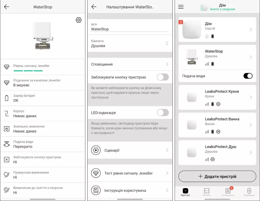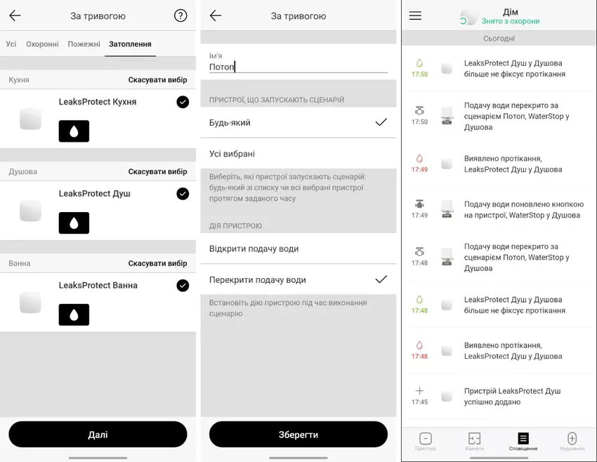 Het belangrijkste waarvoor WaterStop nodig is, is natuurlijk het scenario van uitschakeling door alarm (signaal van de LeaksProtect detector). Ik begrijp niet echt wat het nut is van het openen van de watertoevoer wanneer de lekdetector wordt geactiveerd, maar het is er wel. Natuurlijk is mijn scenario (het belangrijkste voor de WaterStop-gebruiker, denk ik) om het water af te sluiten.