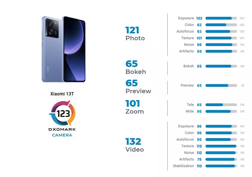 De algemene score van de gadget is 123 punten: 134 punten voor foto's en slechts 114 voor video's. De cameraprestaties van de Xiaomi 13T zijn vooral indrukwekkend op het gebied van belichting, contrast, witbalans, detailbehoud, autofocus, dynamisch bereik en ruisonderdrukking. De camera heeft echter moeite met het leveren van nauwkeurige kleuren in complexe scènes en er is wat detailverlies bij weinig licht.
