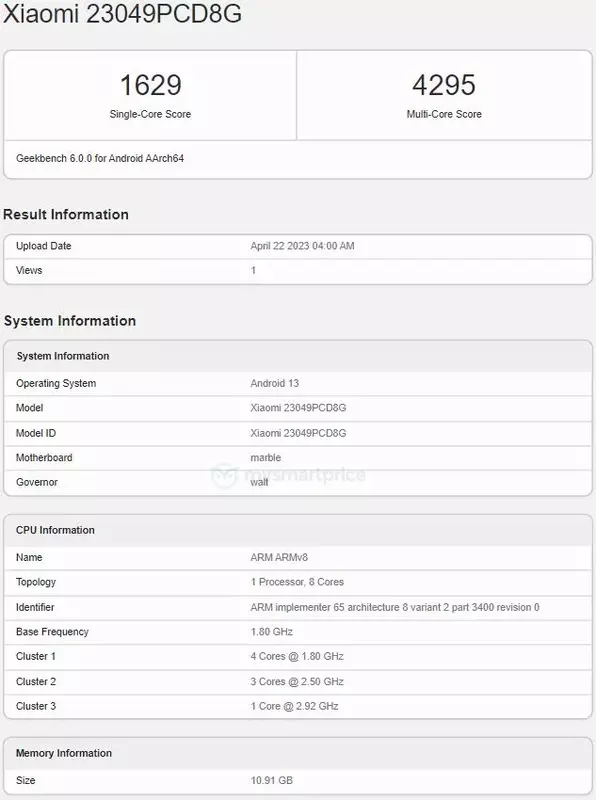 De prestatietest is geslaagd voor de versie met 12GB RAM. Het wist 1.629 punten te scoren in Single-Core modus en 4.295 in Multi-Core modus. Ter vergelijking, de POCO F5 Pro op de Snapdragon 8 Gen 1 chip scoorde respectievelijk 1302 en 4080 punten.