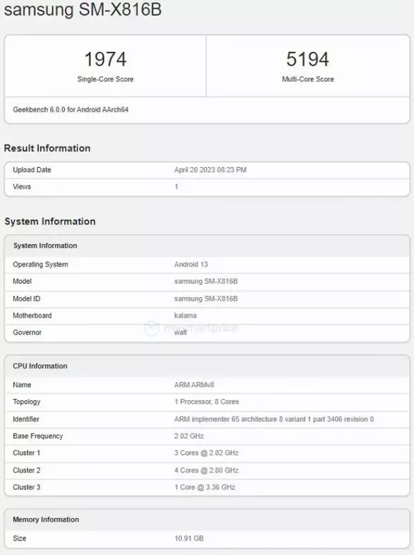 De noviteit komt met het modelnummer SM-X816B. Volgens de documenten wordt de tablet aangedreven door de top-end Snapdragon 8 Gen 2-processor. Het apparaat scoorde 1.974 punten in de single-core Prosivacity test en 5.194 punten in de multi-core test. Daarnaast heeft de gadget 12GB RAM en is het Android 13 besturingssysteem voorgeïnstalleerd.