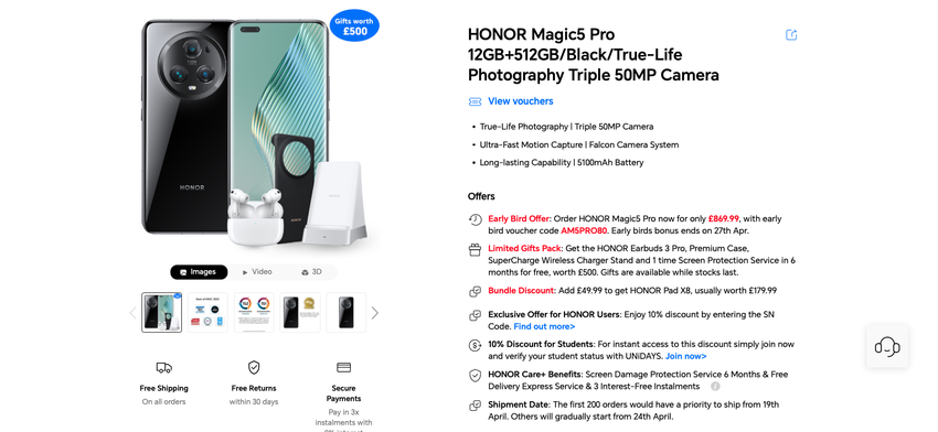 Honor Magic 5 Pro vlaggenschip gaat in Europa in de verkoop, met 500 pond aan geschenken voor eerste kopers