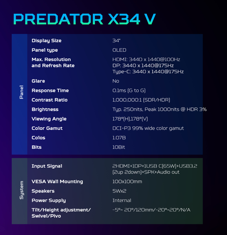 De Acer Predator X34 V beschikt over een gebogen OLED-matrix. De krommingsradius bedraagt 1800R. Het is gebaseerd op een 10-bit organisch LED-paneel met een beeldverhouding van 21 tot 9 en een resolutie van 3440 x 1440 dots. Het scherm heeft een helderheid van 250 nits (typisch) en 1000 nits (piek).