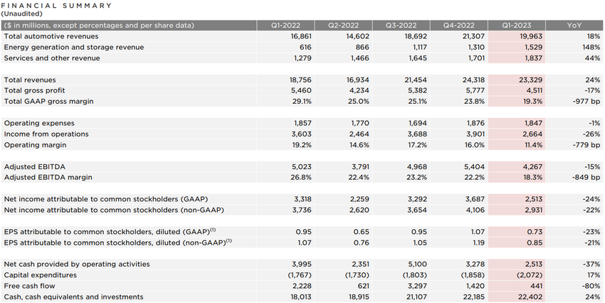 De stijging van de verkoop leidde uiteraard tot een stijging van de inkomsten. Zo groeide de omzet van Tesla in het eerste kwartaal met 24% ten opzichte van dezelfde periode in 2022 tot 23,3 miljard dollar. Bovendien heeft het bedrijf een winstmarge van 19,3%, wat een marktrecord is.