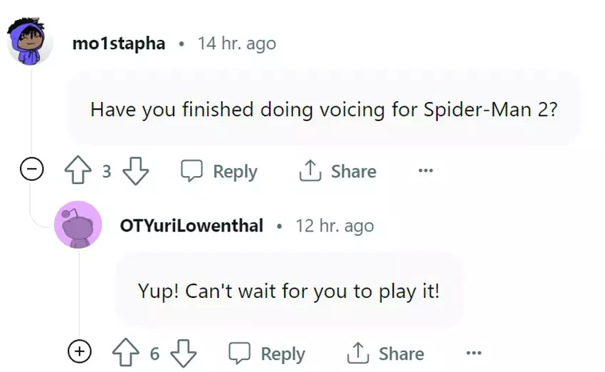 In het bijzonder vroeg een gamer aan Lowenthal of hij Marvel's Spider-Man 2 had voltooid en hij antwoordde: "Ja, ik kan niet wachten om door het spel heen te komen."