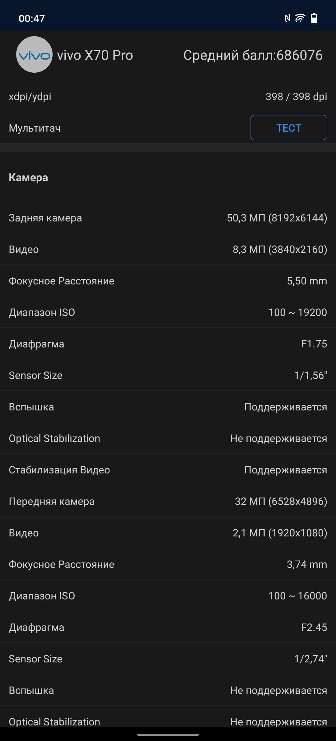 De vivo X70 Pro maakt gebruik van een kwaliteitsmatrix met maximale kijkhoeken, fatsoenlijke helderheidsmarge en een sappig beeld. Niet iedereen houdt van gebogen schermen aan de zijkanten. Maar tijdens het gebruik werden geen valse klikken waargenomen. In de "Bright" modus was de maximale helderheid 407.801 cd/m2, er is een lichte overvloed aan blauwe component en de kleurweergave gaat lichtjes naar koude tinten. Het kleurengamma is aanzienlijk breder dan sRGB.