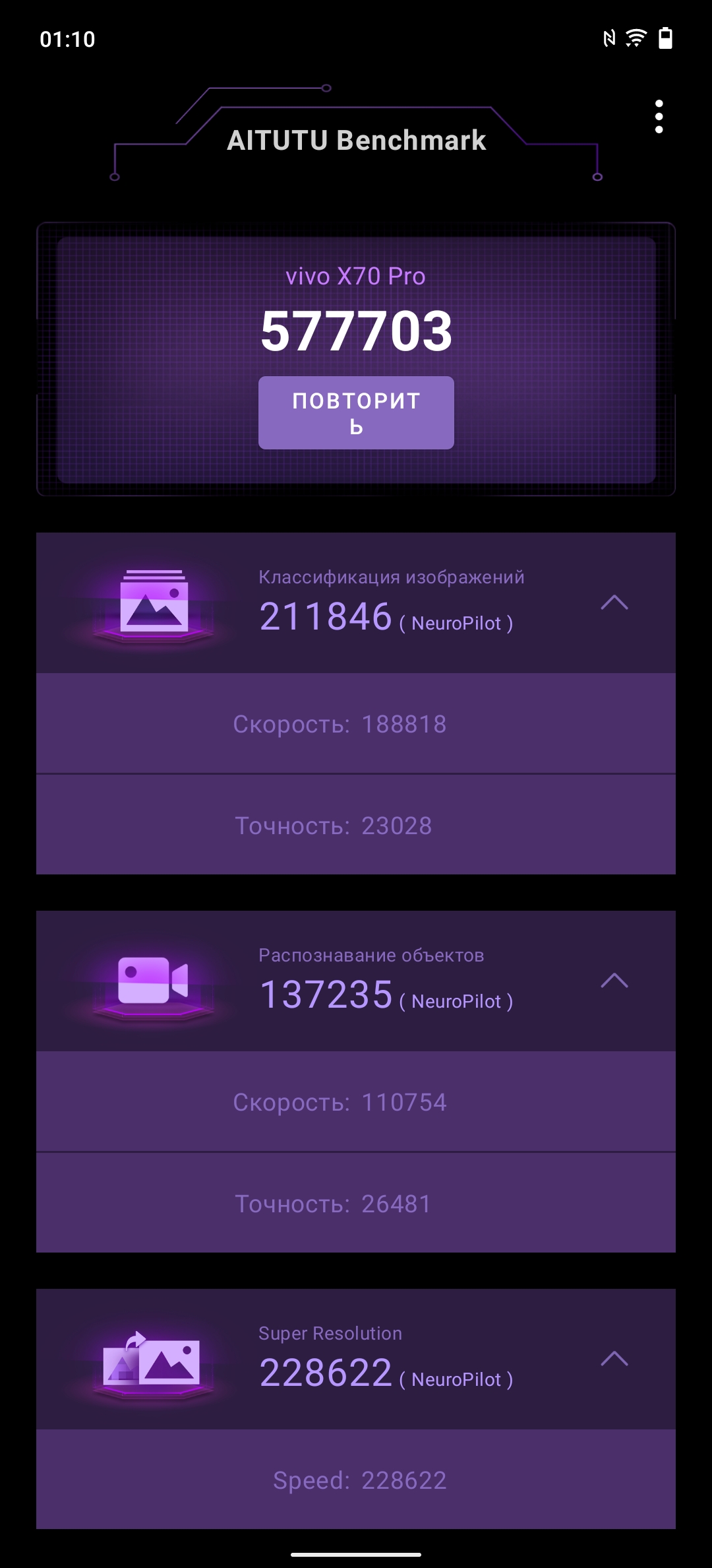 De oudere vivo X70 Pro+ maakt gebruik van het bekende vlaggenschip Snapdagon 888+. De jongere vivo X70 Pro daarentegen krijgt het vlaggenschipplatform MediaTek Dimensity 1200. De processor is gemaakt met 6nm procestechnologie en bevat 1 ARM Cortex-A78 kern op 3,0GHz, 3 Cortex-A78 kernen op 2,6GHz en 4 energiezuinige Cortex-A55 kernen op 2,0GHz. De Mali-G77 MC9 versneller is verantwoordelijk voor de grafische. Dit betreft de zogenaamde "internationale" versie, die door ons is bezocht. De Chinese versie draait op Exynos 1080. De smartphone heeft 12GB RAM, er is ondersteuning voor uitbreiding van het RAM met nog eens 4GB via interne opslag. De interne opslag kan 128GB, 256GB of 512GB zijn, met behulp van UFS 3.1 geheugen. De Dimensity 1200 doet qua prestaties iets onder voor het vlaggenschip Snapdragon 888, en de iets bescheidener Snapdragon 870. Maar over het geheel genomen heeft de smartphone geen enkel prestatieprobleem. Zowel in het werken met zware applicaties, als in games. Resultaten in synthetische tests: