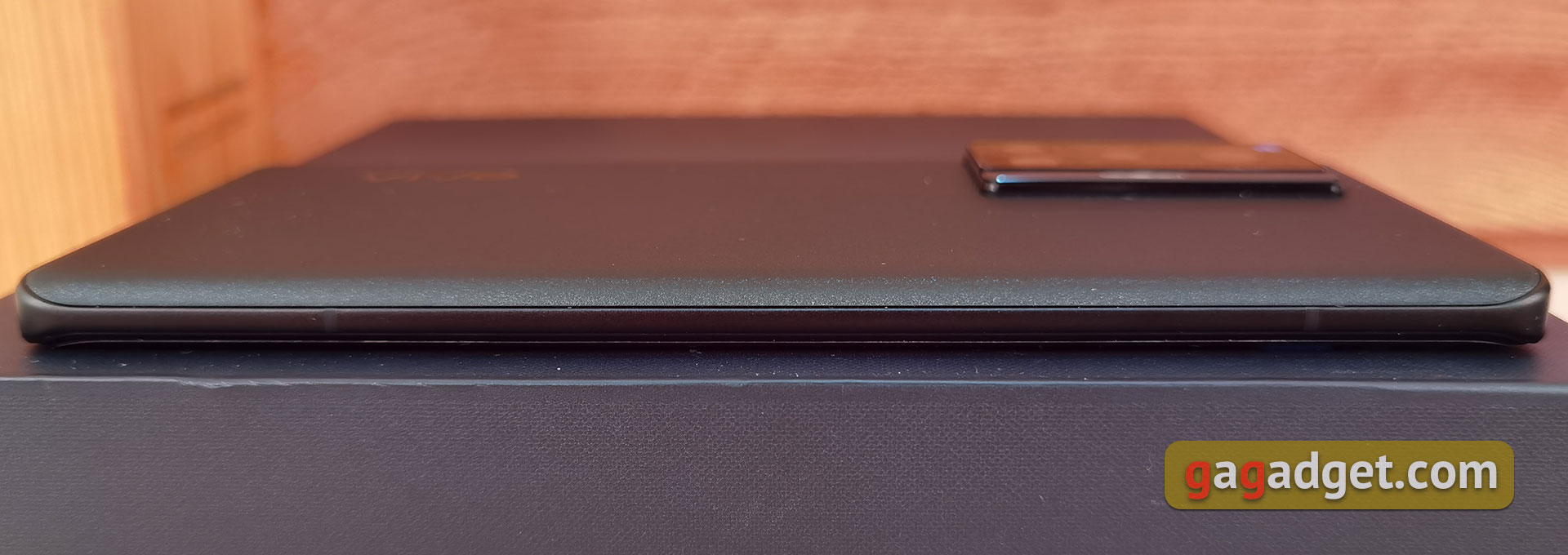 Net als zijn grote broer ziet de vivo X70 Pro er aan de voorkant uit als een typisch modern vlaggenschip: gebogen aan de zijkanten display met minimale kaders, kleine opening voor de frontcamera in het scherm en een dunne luidsprekersleuf. Het bedrijf heeft de achterkant van de smartphone origineel gemaakt. Het heeft een speciale Fluorite AG coating, die de achterkant een matte afwerking geeft, een zeer mooie fluwelen textuur en een zeer fijne schittering in het licht. Het ziet er interessant uit en voelt uiterst aangenaam in de hand. De smartphone zelf is vrij comfortabel, maar (voor mij) te dun: de dikte is 8 mm, waarbij de camera-unit merkbaar boven het oppervlak uitsteekt. Maar dit is een kwestie van smaak.
