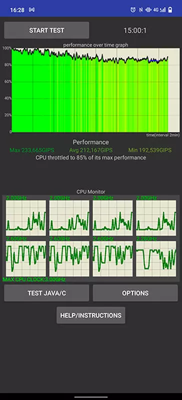 In de CPU Throttling Test dalen de prestaties langzaam en soepel tot 85%. Dit is een absoluut normaal cijfer, vooral omdat er geen plotselinge sprongen en dips zijn. De behuizing van de smartphone is warm na de test, maar niet meer dan dat.