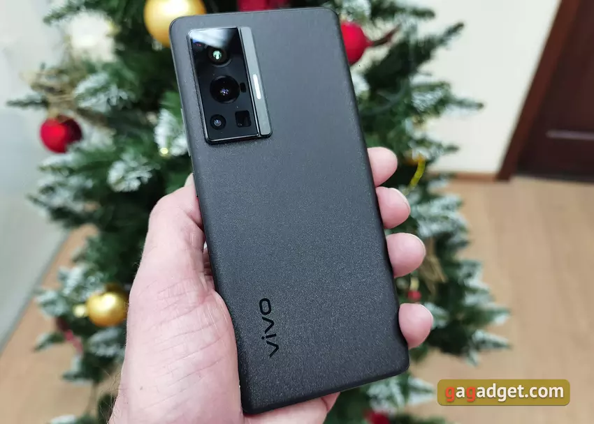 Net als zijn grote broer ziet de vivo X70 Pro er aan de voorkant uit als een typisch modern vlaggenschip: gebogen aan de zijkanten display met minimale kaders, kleine opening voor de frontcamera in het scherm en een dunne luidsprekersleuf. Het bedrijf heeft de achterkant van de smartphone origineel gemaakt. Het heeft een speciale Fluorite AG coating, die de achterkant een matte afwerking geeft, een zeer mooie fluwelen textuur en een zeer fijne schittering in het licht. Het ziet er interessant uit en voelt uiterst aangenaam in de hand. De smartphone zelf is vrij comfortabel, maar (voor mij) te dun: de dikte is 8 mm, waarbij de camera-unit merkbaar boven het oppervlak uitsteekt. Maar dit is een kwestie van smaak.