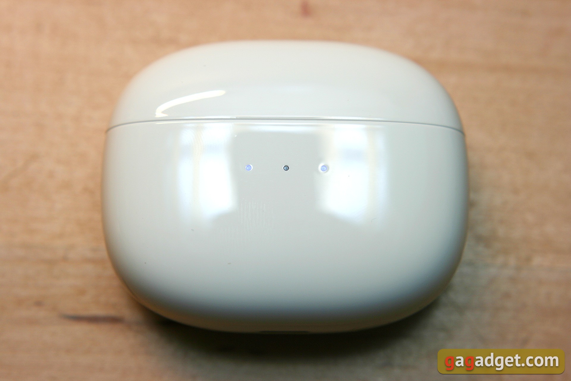 De drie LED-lampjes op het oplaaddoosje veranderen in een driedelige oplaadindicator als er externe stroom is aangesloten, wat handig is. Als de hoofdtelefoon in het doosje wordt opgeladen, pulseren de linker en rechter lampjes wit. Tegelijkertijd, als er maar één oortelefoon in het doosje zit, is dit te zien aan de LED's, er zal er maar één oplichten. Hetzelfde principe wordt gebruikt in de HiTune X5, deze nuance wordt niet beschreven in de handleiding en ik kwam er niet meteen achter hoe het werkt, dus nu vertel ik het hier.