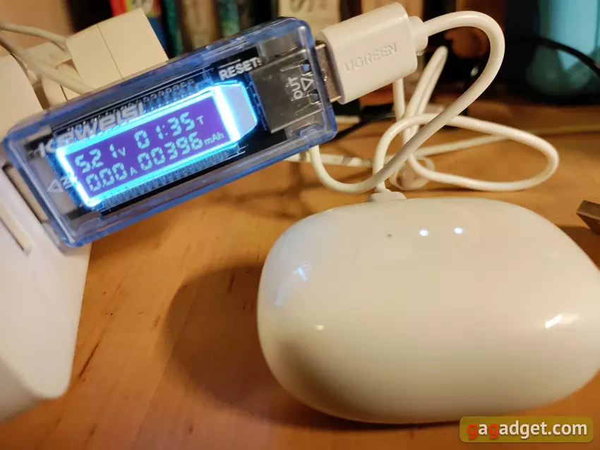 De autonomie is vrij typisch voor deze klasse hoofdtelefoons. We krijgen tot zeven uur continu gebruik buiten het oplaaddoosje aangeboden en tot 24 uur zonder het doosje zelf op te laden. Zoals gewoonlijk is er een praktisch probleem met nauwkeurige metingen, maar in werkelijkheid geven of nemen de cijfers wat wordt beweerd. De levensduur van de batterij is geen record, maar wel voldoende. Ik kon de batterijcapaciteit niet vinden in de specificaties, maar uit metingen blijkt dat er in werkelijkheid ongeveer 400 mAh in de oplaadbox past, dit is een typische waarde. Volgens de fabrikant duurt het twee uur om een volledige lading te krijgen, in de praktijk komt het er nog sneller uit.