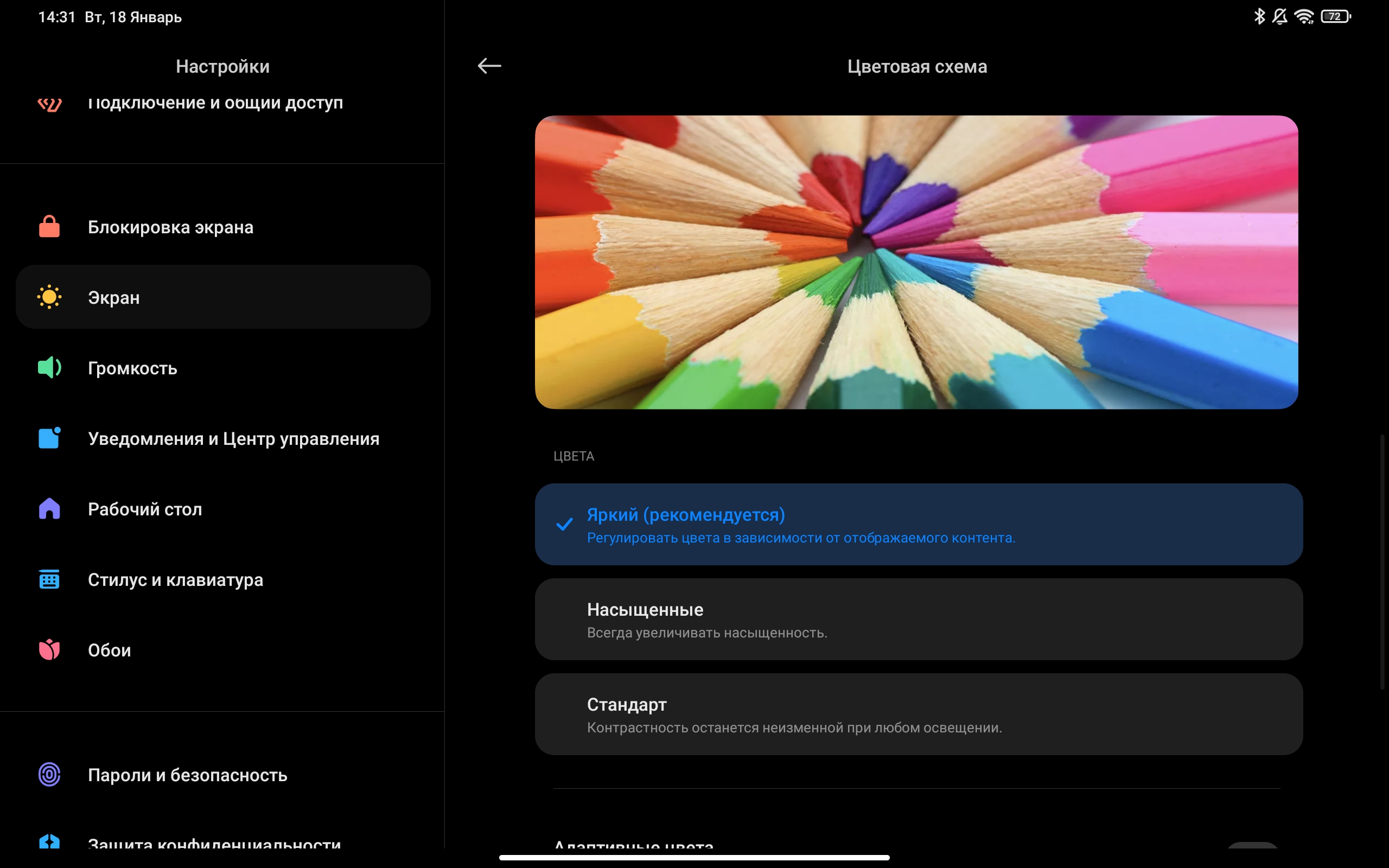 Het Xiaomi Pad 5 scherm maakt een zeer goede indruk, zowel in termen van helderheid reserve en beeldkwaliteit. Ja, zwarten zijn niet zo diep als op AMOLED en het contrast is lager. Maar verder is alles zeer goed. In de "Bright" modus was de maximale helderheid 447.328 cd/m2. Het kleurengamma is merkbaar breder dan sRGB. In feite beloofde het bedrijf DCI-P3. Tegelijkertijd is er een vrij merkbare voorkeur voor koelere tinten, de kleurtemperatuur ligt rond 8500K (met als referentie 6500K). De instellingen kunnen desgewenst worden aangepast.
