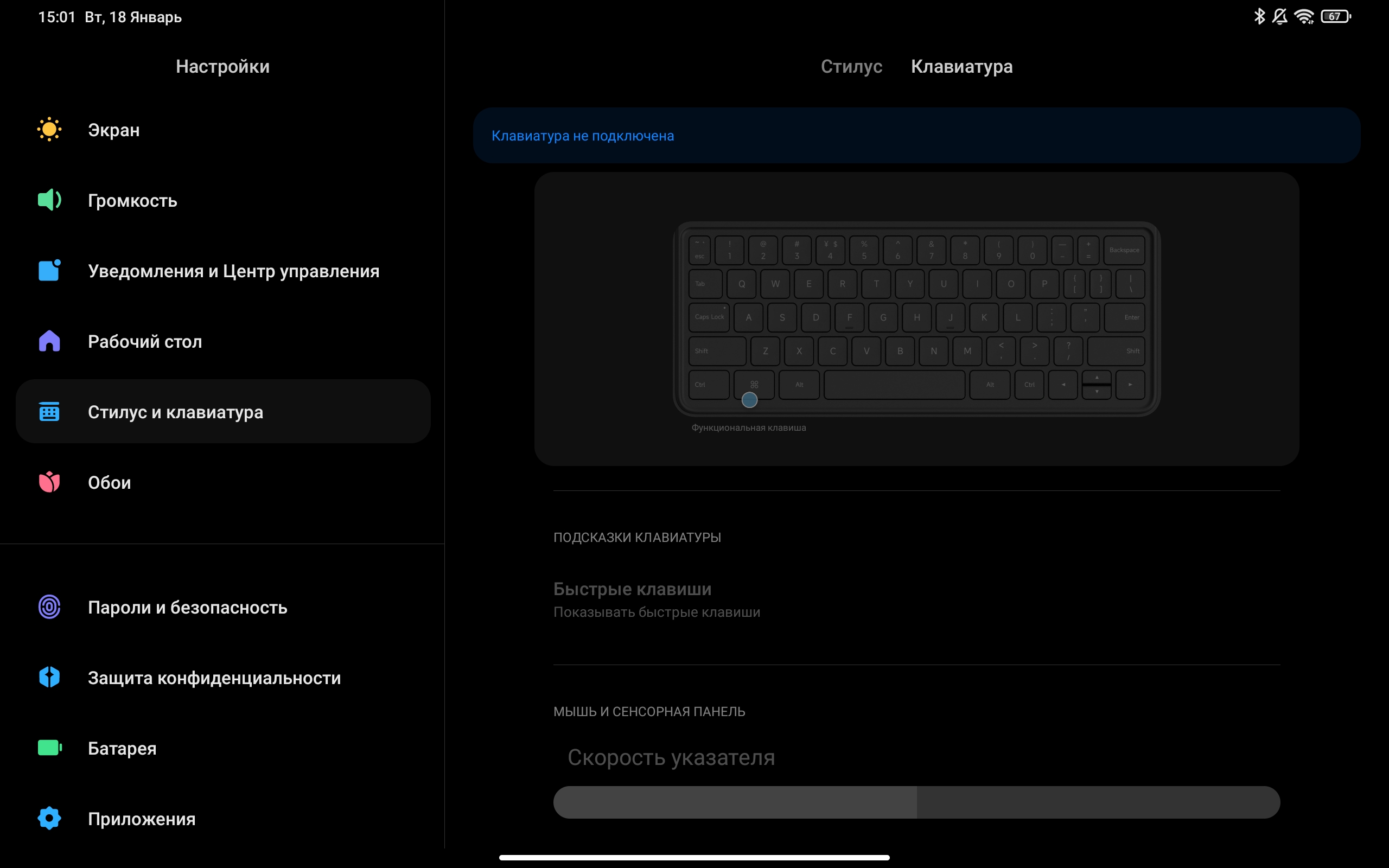 De instellingen hebben een sectie met de merkstylus en het toetsenbord. Er zijn instellingen voor de stylusknoppen en instructies voor snelle acties zoals handschrift of het maken van een screenshot met een lange druk. Door het ontbreken van een toetsenbord en stylus kon dit niet in de praktijk worden getest.