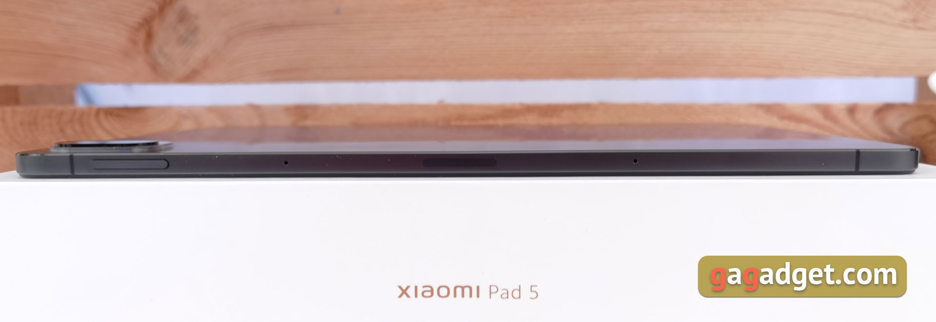 De voorkant van alle moderne tablets Xiaomi Pad 5 verschilt praktisch niet van elkaar. Een groot scherm en een zwart kader rond de omtrek. Het is niet te dun: het is toch geen smartphone, en het is niet helemaal goed om het te dun te maken. Het frame is aan alle kanten even breed en de hoeken van het scherm zijn afgerond en volgen de hoeken van de tablet. Het frame verbergt de lichtsensor en de frontcamera. De frontcamera bevindt zich in het midden van de linkerrand, wanneer de tablet horizontaal wordt gedraaid. Vanaf nu is dit de positie waarin de tablet zich bevindt.