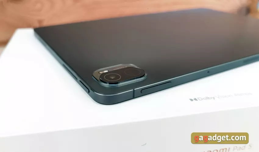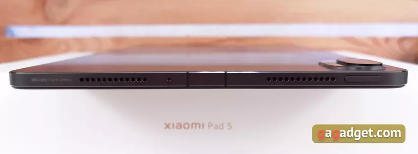 De voorkant van alle moderne tablets Xiaomi Pad 5 verschilt praktisch niet van elkaar. Een groot scherm en een zwart kader rond de omtrek. Het is niet te dun: het is toch geen smartphone, en het is niet helemaal goed om het te dun te maken. Het frame is aan alle kanten even breed en de hoeken van het scherm zijn afgerond en volgen de hoeken van de tablet. Het frame verbergt de lichtsensor en de frontcamera. De frontcamera bevindt zich in het midden van de linkerrand, wanneer de tablet horizontaal wordt gedraaid. Vanaf nu is dit de positie waarin de tablet zich bevindt.